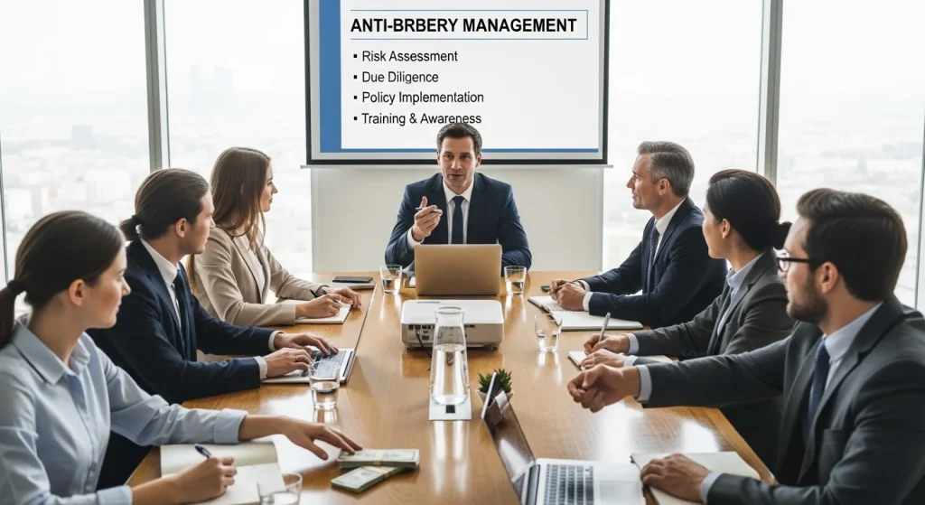 Cubre políticas antisoborno, controles financieros y no financieros, evaluaciones de riesgo, formación del personal, canales de denuncia y acciones correctivas.